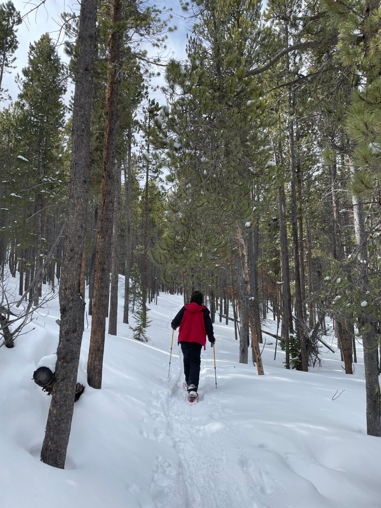 We ate a light breakfast and rented our snowshoes from ‘Estes Park Mountain Shop’. The longhaired millennial quickly fitted us and breezed through the paperwork.
