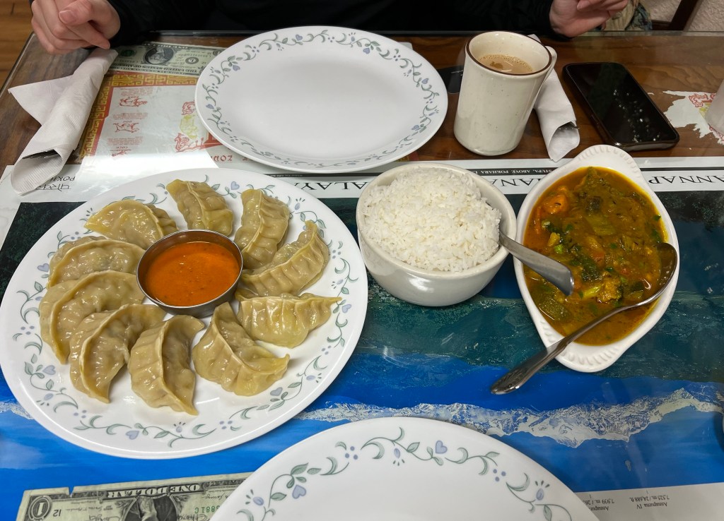 Much to our delight, diners flocked in as we received our appetizers. I ordered a dozen chicken momo and Ash got their vegetable curry. The momo was simply divine. Just like any phenomenal pasta, the wanton wrappers were prepared fresh—packed full of onions, herbs, and turmeric. But what made them truly unforgettable was the rich, comforting sauce to dip.